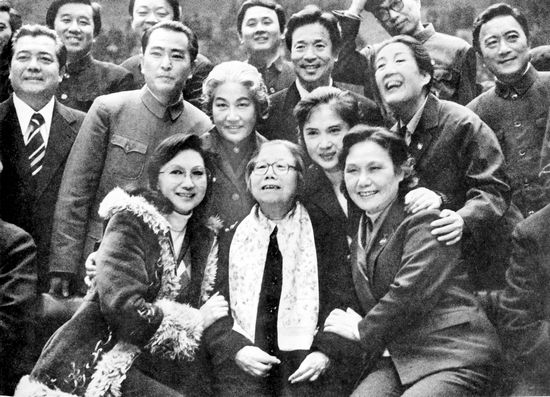 圖一:鄧穎超應邀出席《詩刊》社為慶祝文代會舉辦的詩歌朗誦演唱晚會。演員表演結束后,爭相與她合影留念。左起:前排夏夢、鄧穎超、白楊,二排溫可錚、王鐵成、張瑞芳、李光羲、秦怡、朱琳、孫道臨