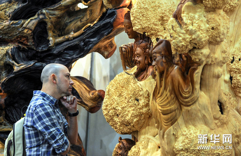 10月6日,一名外國觀眾觀看展出的根雕作品。新華網(wǎng)圖片 韓傳號 攝