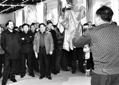 縣長董旭光(左一)、縣文廣新局局長蘇民武(左三)觀看非遺展示 李耀光 攝