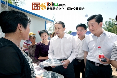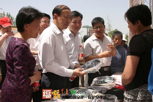 縣委書記高永瑞、縣長趙勇在特色商品展銷區(qū)詢問手工布藝品的制作、包裝銷售情況