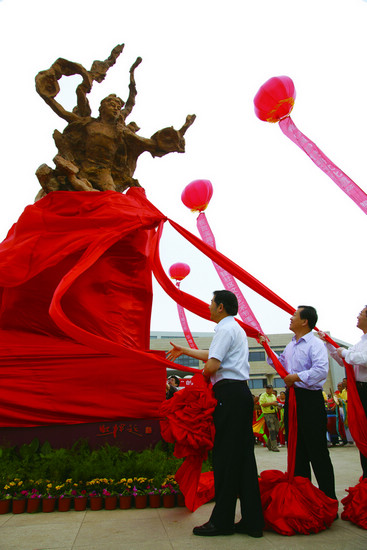 羅楊、呂軍等為漢沽飛镲雕塑揭幕 莫保平 攝