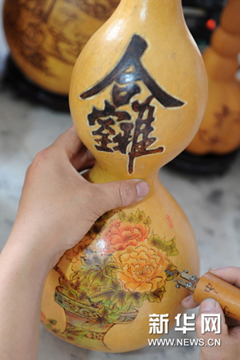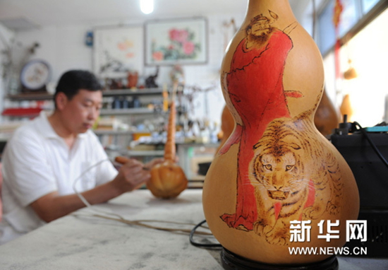6月25日,民間藝人李秀齊在進行燙畫葫蘆創作。新華網圖片 王曉 攝