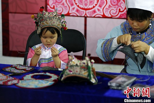 圖為年僅五歲的水族馬尾繡傳承人潘葦葦(左)現場獻技。中新社發 富田 攝