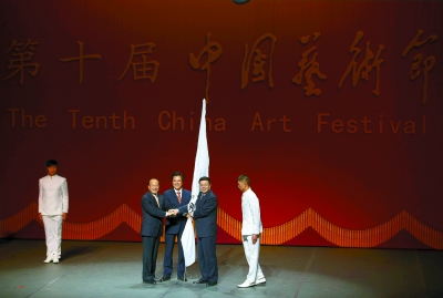 閉幕式還舉行了中國藝術(shù)節(jié)會旗交接儀式,第十屆中國藝術(shù)節(jié)舉辦地山東省代表季緗綺將中國藝術(shù)節(jié)節(jié)旗交還于董偉,并由董偉交給第十一屆中國藝術(shù)節(jié)舉辦地陜西省代表白阿瑩。