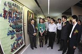 東北亞藝術中心董事局主席周華起(右)陪同中國文聯分黨組副書記覃志剛(右二),吉林省委常委、省委宣傳部長荀鳳棲參觀。