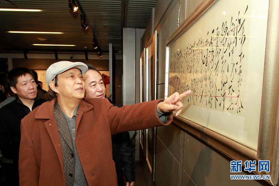 ??? 12月26日,觀眾在展覽上欣賞毛體書法作品。當日,為紀念毛澤東同志誕辰119周年,周鵬飛毛體書法作品展在中共一大會址開幕。展覽集中展示了毛體書法家周鵬飛創作的80余件毛體書法作品。(新華社記者 裴鑫 攝)
