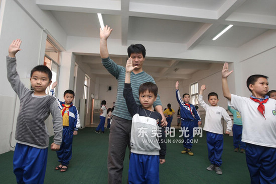 下午4時許,南城小學5樓的舞蹈室人聲鼎沸。這正是南城小學粵曲班的訓練時間。粵曲班的30多名小學生正分成兩批跟著鎮曲協的演員老師練身段和發聲等基本功。