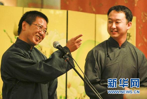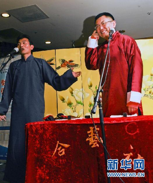 5月5日,在澳大利亞悉尼舉行的“悉尼相聲大會”上,悉尼“合藝社”相聲演員朱炎龍(左)與趙竹毅表演相聲。當天,由悉尼“合藝社”組織的“悉尼相聲大會”舉行,該社的部分演員表演了《鈴鐺譜》、《學外語》等相聲段子。