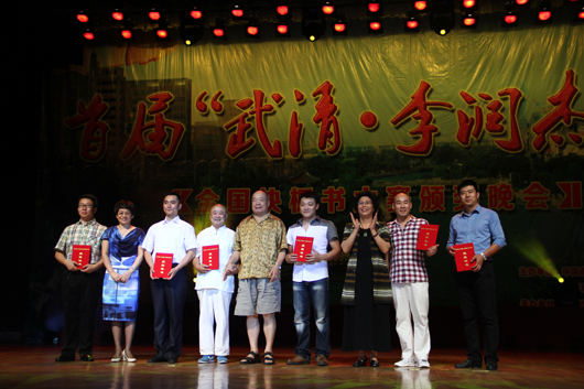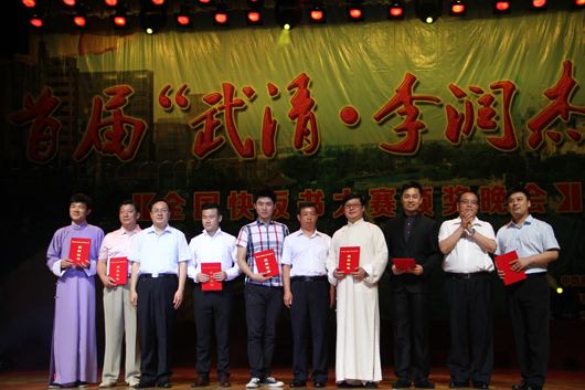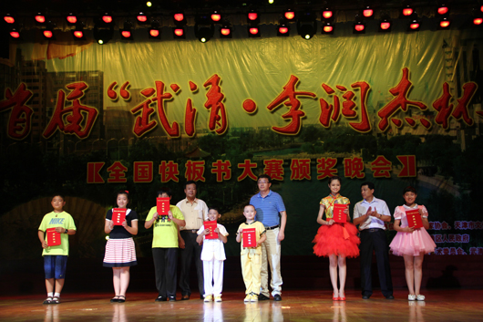 從3日到5日,經(jīng)過(guò)3天5場(chǎng)的激烈角逐,共評(píng)出職業(yè)組、非職業(yè)組、少兒組一等獎(jiǎng)分別為7個(gè)、6個(gè)和6個(gè)。5日晚,頒獎(jiǎng)晚會(huì)在武清區(qū)天獅集團(tuán)會(huì)議中心舉行。中國(guó)曲協(xié)主席、中國(guó)文學(xué)藝術(shù)基金會(huì)副理事長(zhǎng)兼秘書(shū)長(zhǎng)姜昆,中國(guó)曲協(xié)分黨組書(shū)記、主會(huì)副主席、秘書(shū)長(zhǎng)董耀鵬,中國(guó)曲協(xié)顧問(wèn)、中國(guó)曲協(xié)快板藝委會(huì)名譽(yù)主任朱光斗,中國(guó)曲協(xié)分黨組副書(shū)記刁惠香,中國(guó)曲協(xié)分黨組成員、副秘書(shū)長(zhǎng)曲華江和武清區(qū)委、區(qū)政府有關(guān)領(lǐng)導(dǎo)出席頒獎(jiǎng)晚會(huì)。晚會(huì)由相聲表演藝術(shù)家牛群、中央電視臺(tái)文藝頻道主持人周宇主持,姜昆、戴志誠(chéng)、郭達(dá)、高洪勝、張志寬、柴京云、柴京海、溫淑萍、焦建東、石磊、王彤、隨風(fēng)、高夢(mèng)嬌等為武清觀眾奉獻(xiàn)了精彩的節(jié)目。