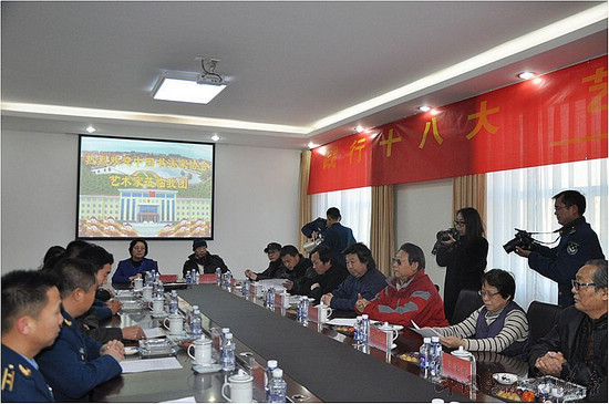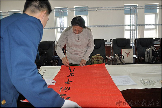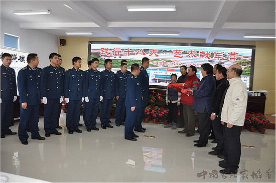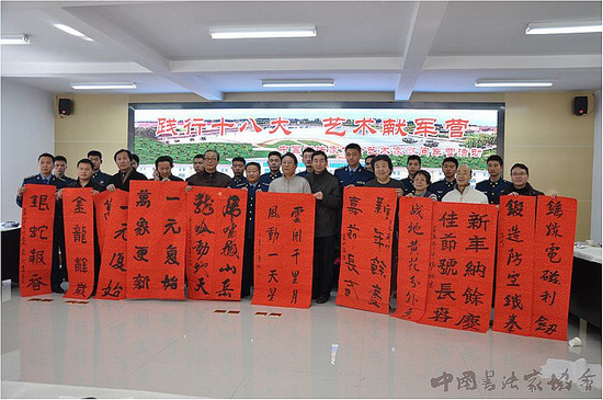 為貫徹黨的十八大精神,秉承中國書法家協(xié)會中央國家機關分會送溫暖下基層一貫作風,于2012年12月月23號上午10點由中國書法家協(xié)會中直分會組織的書法藝術家一行,冒著零下十多度的嚴寒,不辭辛苦來到北京市通州區(qū)三間房空軍某部慰問人民子弟兵。中國書協(xié)理事、中直分會副會長楊秉延,張杰,中國書協(xié)培訓中心書記、中直分會副秘書長章巧診,中國書法家協(xié)會網(wǎng)編輯部副主任、中直分會副秘書長邵玉祥,中國金融書法家協(xié)會副主席兼秘書長韓啟超,通州區(qū)民政局書記、雙擁辦主任儲懷森,中國人民解放軍93656部隊蔡斌團長,王彥軍政委,書法家王昌寧、蘭可模、鞏法根、楊佐桓、王靖以及新聞媒體的朋友們參加了此次慰問活動。