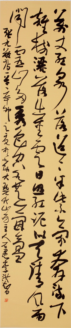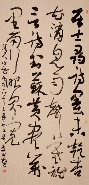 與以往書法展不同,本次“墨痕——李洪智書法展”展出的是近十年李洪智教授創作的50多幅書法佳作。受恩師啟功先生影響,李洪智一直對古文字有很深的研究,這種學養的積淀,使得他的草書動如行云流水,靜似青松蒼勁雄厚,大氣磅礴,龍伸蠼屈。在表現形式上,他的章法布局相當舒朗,使作品簡單純凈而又富有動感。