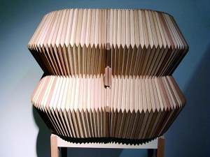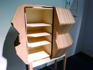 德國設計師Elisa strozyk和藝術家Sebastian neeb合作設計了這款“手風琴書柜”。這件儲藏柜外部的薄木片層像手風琴一樣被折疊起來。用激光切割的木片手工固定在一個織物(比如萊卡布料)表面上。這兩種材料的巧妙結合,讓木片表面像布料一樣柔軟有彈性。手風琴一樣的表皮將矩形的柜子包裹起來,不用的時候它就像門一樣可以關閉,絕對是個收納小東西的好幫手。