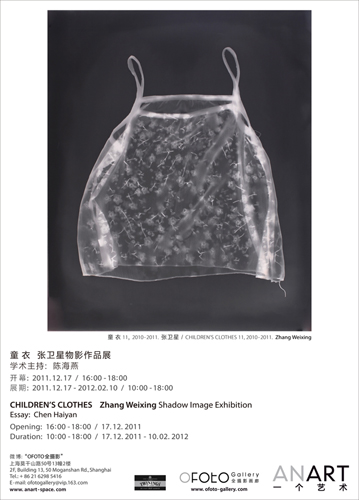 夢斷落花飛絮,這些宛若浮云的負像懸浮顆粒,有悖于我們通常認識的完美攝影,甚至我們很難界定它是嚴格意義上的攝影作品,因為張衛星根本就沒有用相機的鏡頭來捕捉成像,只是在暗室中實驗性地將童衣直接覆蓋在24英寸感光相紙上進行曝光,通過顯影和定影藥水的復雜控制程序,制造出一種界于復制、幻像、攝影、X光片之間的等比負像。這一造像過程受限于攝影技術本體中的尺幅大小、曝光時間的長短、曝光次數、藥液的成分、新舊程度、施藥次序;受限于衣物本身的面料材質、花色圖案、纖維密度和經緯織造工藝,也受限于藥液引流所呈現的偶然性和不可復制性。