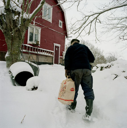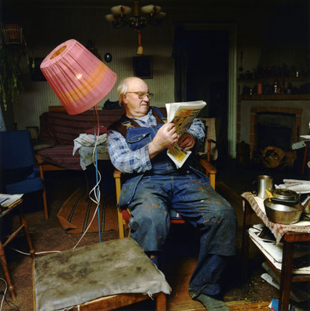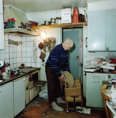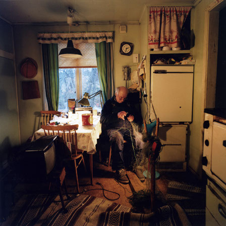 彼得·德·魯(Peter de Ru)拍攝的這位叫做Sven的老人,運用方畫幅以及質樸的記錄手法,描繪了老人生活中的點點滴滴,透過這些片段,還原了一個孤獨老者的生活狀態(tài):從他采收的蘋果、丟棄的廢電池、寫滿了各種標記的日歷牌,到他穿著滿是污漬的工作裝在起居室看報、在電視旁修補漁網,在凌亂的廚房里準備冬日的儲藏,觀看者由 此構建起自己的印象,關于這個老人,關于他生活的環(huán)境。我們看不到老人生活中還有其他家人的影子。單純從照片來看,我們可以想象這是北歐典型的孤獨老人的生活。
