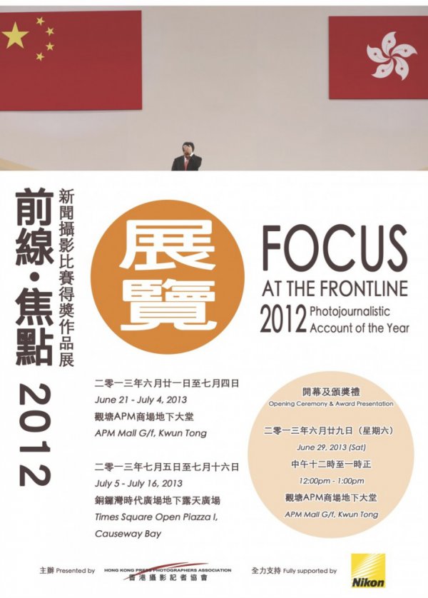由香港攝影記者協會主辦的“前線·焦點2012”新聞攝影比賽得獎的圖片6月21日至7月4日在香港銅羅灣時代廣場apm商場展出。