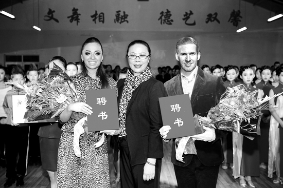 為了提高學生拉丁舞整體水平,讓學生及時了解世界最優秀的拉丁舞者的風范和追求,學院邀請英國黑池舞蹈節獲業余組拉丁舞冠軍的尼爾·瓊斯和葉卡捷琳娜·索科洛娃來學院為學生授課,并在11月29日的“希望杯(舞王爭霸)”賽開幕儀式上進行了精彩的表演。這對世界冠軍接受了擔任學院客座教授的邀請,將根據學生的具體水平,有針對性地進行拉丁舞的教學。孫偉英向尼爾·瓊斯和葉卡捷琳娜·索科洛娃頒發了客座教授的聘書。