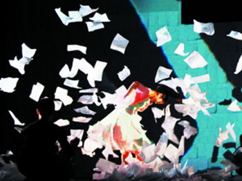 “我看不懂現(xiàn)代舞”,是許多觀眾初次欣賞現(xiàn)代舞演出不由發(fā)出的感嘆。而《情書》在走出小劇場,投向大眾市場的過程中,試圖透過劇場文本、錄像、場刊宣傳等各種手段讓觀眾看得明白。該劇以“情書”這一通俗話題為主題,并請來本土電臺DJ子風客串演出,在幕與幕之間,穿插讀出提示劇情的5封情書,為觀眾的欣賞提供了解讀線索。劇中的5幕演出,分別展現(xiàn)了纏繞兩代人的骨肉親情、自我追逐的摘星豪情、青春煥發(fā)的一往深情、被愛遺忘的孤寂逃情及最后驀然回首的豁達忘情。作為全劇主題的一紙“情書”,在舞美師賴妙芝的設計下,更營造出千變萬化的效果,數(shù)千張A4紙貼滿了舞臺的布景,又幻化成參天大樹,更滿臺紛飛伴著舞者一起騰空,為觀眾帶來強烈的視覺震撼。