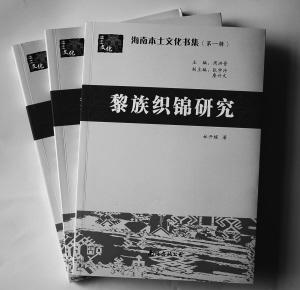 黎族專家林開耀先生,長期從事自己民族文化的研究,對黎族織錦藝術更是一往情深。《黎族織錦研究》一書是林開耀先生所著,為海南省社科聯規劃的《海南本土文化書集》第一輯中的一部,南海出版公司2011年4月版。他深知搶救和保護這一非物質文化優秀遺產的重要性和緊迫性,立志要對黎族織錦藝術作一項較為完整的理論探討和總結。他長期深入民間,查訪、收集、研究,積多年之力,廣泛征求意見,幾易其稿,終于與他的合作者一道完成了這一心愿。在這本書中,作者對黎族織錦產生與發展的歷史,對織錦及相關工藝的技術和操作過程,對以織錦為基礎的傳統服裝、龍被、飾品的特點,進行了挖掘、整理和探討,并插入大量珍貴的圖片文獻。可以說,這是黎族織錦研究領域中的一個可喜的收獲。它也許還存在著一些不盡令人滿意的地方,但它必將在民族傳統文化保護過程中發揮重要的作用。