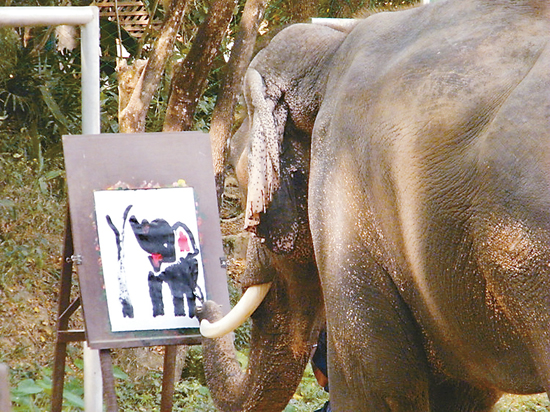 接著是大象畫畫的精彩節目。象人先在場地上擺放一個貼著一張白紙的木質畫架,然后提來一個放著畫筆和顏料的文具箱。大象站立在畫架的對面,象人遞給大象一支上了顏料的畫筆,大象用鼻子接住。大象的鼻子拿著筆,在白紙上涂抹幾下,于是就出現了幾條黑色的樹干狀的豎道道。接著,象人又給大象先后換了黃色、綠色、紅色的畫筆,這回畫的不是直線,而是“點染”的塊狀:幾處紅色,幾處黃色,幾處綠色。完了,整幅畫,色彩斑斕,粗線條與塊狀錯落搭配,儼然是一幅相當不錯的寫意畫或者印象派的畫!畫畢,大象排成隊,以鼻子給觀眾致意。這次共有四頭大象做畫,幾乎同時收筆。四幅大象的美術作品出現在眾多的觀眾面前!遠處觀看,確實像那么回事,如若不說,誰也想不到這些作品是大象畫的!大象下場后,那四幅畫就擺在空地上,標價出售:1000泰銖。我很想買,以為此行的紀念,但家人勸阻,覺得畢竟是動物的作品,買了會見笑于人,遂作罷。但我的心中,仍舊不能釋然。
