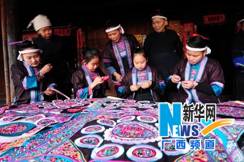 1月26日,廣西柳州三江侗族自治縣同樂鄉同樂村侗族群眾在刺繡。