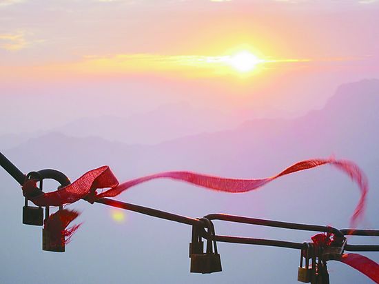 從較低的北峰,一直登上擦耳崖、蒼龍嶺、金鎖關、東峰、南峰、西峰,一路走來,多了兩樣色彩,黃色和紅色。黃色是鎖,紅色是絮。謂之金鎖、長命鎖、同心鎖。鎖上拴一縷紅布花絮,飄逸醒目。重重疊疊,一摞一摞,如膠似漆,緊鎖在沿途的護欄石柱上,鐵鏈上。越是高拔險峻的地方,金鎖越多。常常的,會出現一個畫面。高高的花崗巖石上,沒有一棵樹,沒有一株草,只有一長溜艷麗的紅黃鐵鎖,俠士一般,傲立峰頂,構成了華山一道新的景觀。