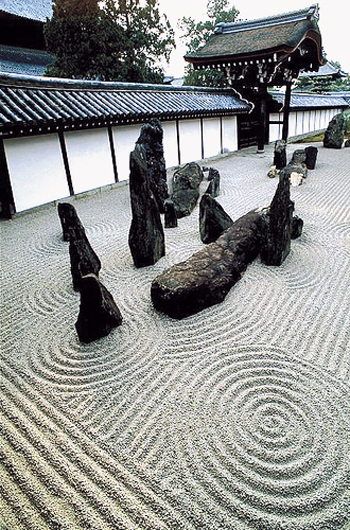 這根頭發(fā)的故事,在某種程度上也是日本園林的故事。記得2001年在京都相國(guó)寺,就曾經(jīng)在墻角的位置發(fā)現(xiàn)一根被精心打理過的草。這根草長(zhǎng)在泥土里,但草根部的周圍卻如禿子的頭頂一樣一塵不染。當(dāng)時(shí)我是深感震撼的。真難以想象,對(duì)這根草的護(hù)理,每天得花費(fèi)園林師多少時(shí)間和精力。