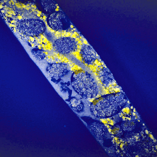 這是一幅無標記的顯微成像圖片,該作品運用現代最新成像技術CARS系統(Coherent Anti-Stokes Raman Scattering反斯托克斯拉曼散射顯微術)觀察得到的圖像,在技術上具備先進性,具有重要的學術價值和應用意義。