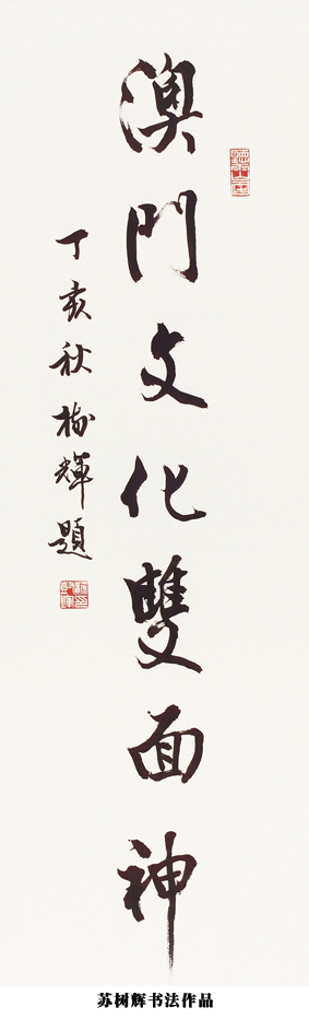 在多次書展中,最有意思的是“澳門文化雙面神”書法展。此展內容多為澳門歷史上不同年代、不同詩人吟詠澳門的詩詞,涉及文化交融、宗教歷史、風土人情等。蘇樹輝書有“圣德齊天恩流鏡海 母儀稱后澤沛蓮峰”,媽祖為中國沿海居民信仰之一,在澳門民間信仰中占有重要地位,因閩商航海貿易之需將媽祖神像奉迎于澳門以求庇佑航運順利。蘇樹輝說舉辦這個書法展的目的正是希望通過詩詞和書法兩種風格各異的藝術形式,表現澳門獨特的文化氣質和魅力形象。