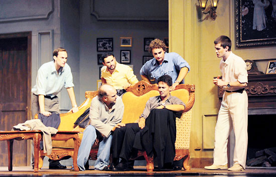 《古怪的一對》劇照,在生活壓力重壓下的白領男們互訴衷腸。賈占生 攝
