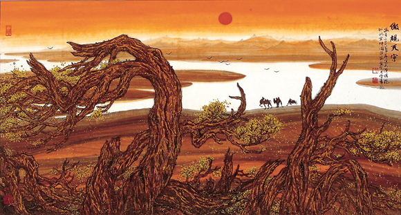 新疆占中國(guó)的六分之一,“不到新疆,不知中國(guó)之大”。但一部中國(guó)山水畫(huà)史卻沒(méi)有新疆的畫(huà)卷和記載,令人遺憾不已!由于新疆山水不同于傳統(tǒng)山水的特質(zhì),也不同于中原江南山水的特質(zhì),古人沒(méi)有畫(huà)過(guò),現(xiàn)代人畫(huà)過(guò)的也不多。在中國(guó)山水畫(huà)的歷史演進(jìn)中,在傳統(tǒng)技法和理論體系方面都沒(méi)有現(xiàn)成的范本可供借鑒,更沒(méi)有前人的路可走。作為置身新疆西域大漠的山水畫(huà)家,我們有責(zé)任和使命開(kāi)創(chuàng)新疆山水畫(huà)新的表現(xiàn)形式,在新疆獨(dú)特的地域特征和豐富深厚的民族文化基礎(chǔ)上,吸收、借鑒古今中外一切優(yōu)秀藝術(shù)文明成果,探索發(fā)現(xiàn)并創(chuàng)造新的筆墨程式和藝術(shù)語(yǔ)言,“融合古今,折衷中西,繼往開(kāi)來(lái)”,則是我們明智的選擇和目標(biāo)。