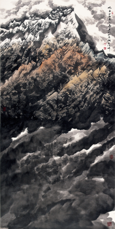 高原系列中運用嶙峋怪石似的寫意和層層積染的積墨筆法,使得這種占領顯得更為簡潔和犀利,省去了所有枝蔓和過程,直搗黃龍。中國畫是一個感性認知過程的表現,所要刻畫的不是物理客體,而是內心的認知,“因心造境,以手運心”。比之西方繪畫,中國畫更多強調的是心的感悟,而非手的繪畫制作技巧。“知畫之為物,是性靈者也,思想者也,活動者也,非器械者也,非單純者也”。用自矜的話來說,中國畫需要更多的自我修養和更多的文化,所以“文人畫”便成了中國繪畫的一種標高和標志,成了藝術與匠人之間的分野,正如張彥遠《歷代名畫記》所云:“自古善畫者,莫非衣冠貴胄,逸士高人,非閭閻之所能為也。”寫意技法便是文人畫思想的物質手段,是感性認知的技術表現。作為一介“文人”的張文華,在高原的幾年游蕩中,他帶著從學院中練就的寫實基本功,在離天最近的地方,感受和體悟著高原的凄寂與悲壯,尋找著最貼切的語言表達形式,思考著藝術本體中的許多問題,此時,只需心在高處。所以高原系列要傳遞的并非高原美景,而是對這種景致真切感受。山峰如戟,天空如染,草原如涌,這種快捷和酣暢的筆法的確給人以強烈的視覺沖擊,這不僅可以更為真切地表現青藏高原荒野蒼茫的粗礪質感,而且也更能契合中國畫中“不下堂筵,坐窮泉壑”的意趣和境界,誠所謂“畫者不過意筆草草……寫胸中逸氣耳。”