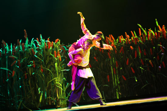 劇中九兒的扮演者、國家一級演員史茹深入細致地詮釋了九兒這個敢于追求自由和真愛,面對侵略勇敢抗爭的堅強女性人物。史茹說,“在演出時,我就把自己當成是九兒,去感受她的愛恨情仇。” 導演丁建英表示,他特意將九兒設(shè)定為一個草臺班子出身的戲曲藝人,融合了莫言《紅高粱》系列小說中其他女性人物的特點,并把戲曲中“扈三娘”的形象附加在角色身上。演出中,九兒身著“扈三娘”戲服演唱的那首“靠山吼”多次響起,表達著不屈的抗爭意識,是這部劇的一個鮮明特色。演員們精湛的演技,配著舞臺上濃密的高粱青紗帳、真實壯觀的酒神廟場景、夸張的酒壇和大酒碗,以及紅色燈光渲染的悲壯場景,讓整部戲在劇情精彩的同時,極富視覺沖擊力。
