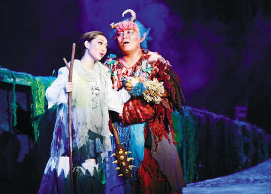 扮演滑稽鬼的李爽身披樹葉、面畫鬼臉、頭上長角、手拿短棒,走路搖擺,歌聲憨厚樸實,像是一個大孩子。扮演雪兒的演員身穿白衣、駐拐杖,摸摸索索,歌聲傷感,引人同情。滑稽鬼嗓音寬厚、表演真實,有音域、有音量、好音色,激情澎湃且音準節奏把握不錯;雪兒歌聲圓潤、表演自然,發聲通暢且表演入戲。兩位主角的演唱與表演都相當不錯,旋律再熟一些,聲線再好一些,節奏與速度更準確一些,段落與結構再清楚一些,演唱效果還會更好。這些問題只是演出熟能生巧的問題。
