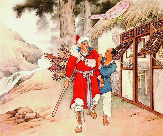 那就從景陽岡說起。第二十二回,武松與宋江分手以后,來到陽谷縣地面,正當晌午,走得饑渴,望見前面有一處酒店,挑著一面招旗,上寫“三碗不過岡”。武松進入酒店,把哨棒依了,叫道:“主人家,快把酒來吃!”①店主人把“三只碗,一雙箸,一碟熟菜,放在武松面前,滿滿篩一碗酒來”。武松一飲而盡,叫道:“這酒好生有氣力!”三碗過后,店主人“再也不來篩”,武松再要酒喝,店主人向他解釋:“俺家的酒,雖是村酒,卻比老酒的滋味;但凡客人來我店中,吃了三碗的,便醉了,過不得前面的山岡去,因此喚作三碗不過岡。”武松哪里肯聽,勒逼主人上酒,前后喝了十八碗,結了賬,綽了哨棒,走出店門,笑道:“卻不說‘三碗不過岡’!”他哪里知道這酒有后力呢?