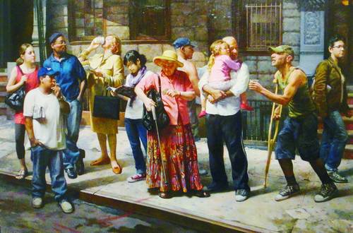 而最震撼我的,還是馬克斯·金斯伯格的三幅油畫:《公共汽車站》《皮耶塔戰爭》《無法贖回》,都是人物群像畫,只是將特定場景放入一種復雜的社會大背景里,融入更多的現實苦難和個人的慈悲感,通過群體人物的姿勢、動作和表情,表現畫家的時代責任感和人文關懷?!豆财囌尽罚锌磿墓媚?,有抽煙的男人,有抱著小孩的老漢,也有以不同姿勢站在那里等車的人,一位拄著拐杖的乞丐老漢,走過來伸手乞討,一位戴著草帽的老婦人從包里掏錢(給乞丐),更多的人只是無關自己地望著……這是今天社會最普通的一種場景,但它充滿著人性的關懷,充滿了畫家冷靜的慈悲感?!镀ひ馉帯罚粋€女人雙手抱扶著躺在地上的男人的頭,仰天嚎啕大哭——那男人是她的丈夫,頭上裹著滲血的紗巾,躺在地上,一只腿、一只手都已被炸掉……而他們的背后卻是戰爭滾滾的硝煙——畫家在呼喚和平,呼喚人道。還有好像是再現美國9·11事件現場目睹者表情的《無法贖回》,重現一種悲傷的記憶,喚醒人們對生命的珍惜,對大愛的追求及對慘無人道之惡行的譴責。