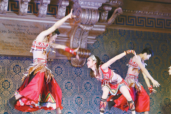 2012年“今日中國藝術周”的三站演出地點都在音樂廳,場地小,舞美燈光條件有限,尤以哈佛大學劇場的舞臺最小,但音響效果也最好。根據舞臺的特點,演出主要以小型節目為主。雜技《頂花壇》和《三人滾杯》,節目小而精,且屢獲國際國內大獎,前者詼諧,后者優美。“今日中國藝術周”正是體現今日中國藝術年輕的風貌。這次參加演出的舞蹈節目皆由東方演藝集團“80后”骨干演員擔綱,男子群舞《水墨天書》、女子獨舞《扇舞丹青》在民族傳統藝術的基礎上融入了現代舞元素,盡顯活力。這次演出還注重傳統與現代藝術的結合。既有古典舞蹈《荷花賦》,傳統笛子曲《妝臺秋思》,又有根據意大利小提琴曲改編的《查爾達什》和現代電影音樂簫獨奏《牧羊曲》,更有針對美國觀眾的民樂協奏《泰坦尼克號》的主題曲。還展示了民族文化的多樣性,漢族雅樂《長相知》《禮》,新疆的歌舞《天山放歌》《花兒為什么這么紅》、蒙古族的長調和歌曲《吉祥三寶》、佤族的舞蹈《山戀》、琵琶獨奏《彝族舞曲》,富有民族特色的節目深受國外觀眾的歡迎。