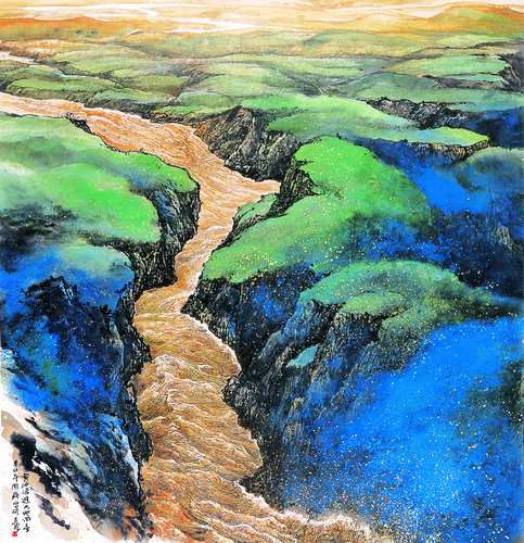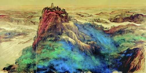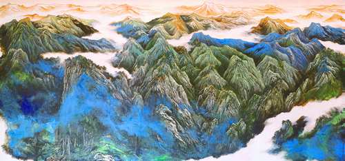 云橫秦嶺 1000cm×2000cm 為大明宮國家遺址公園創(chuàng)作巨幅金碧青綠山水畫