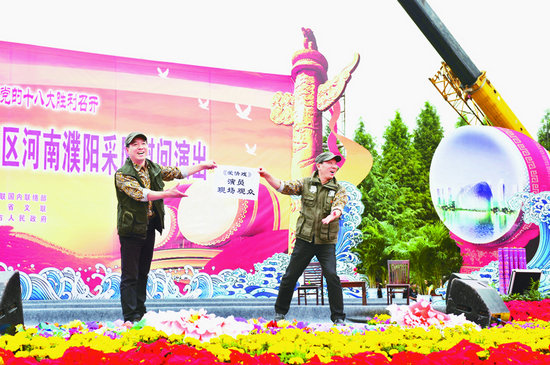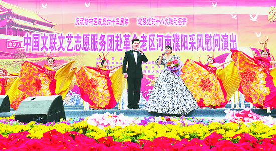 這里,為慶祝新中國成立63周年、喜迎黨的十八大勝利召開,由中國文聯主辦,中國雜協、中國文聯國內聯絡部、河南省委宣傳部、河南省文聯、濮陽市委市政府承辦的中國文聯文藝志愿服務團赴革命老區河南濮陽采風慰問演出活動正在進行。藝術家們的精彩演出和真摯祝福讓當地群眾在中秋、國慶兩節前夕感受到了喜慶與溫馨。歌聲在這里飛揚,笑聲在這里彌漫,掌聲在這里飄蕩,而“愛國、為民、崇德、尚藝”的文藝界核心價值觀也在這里彰顯和生動詮釋……