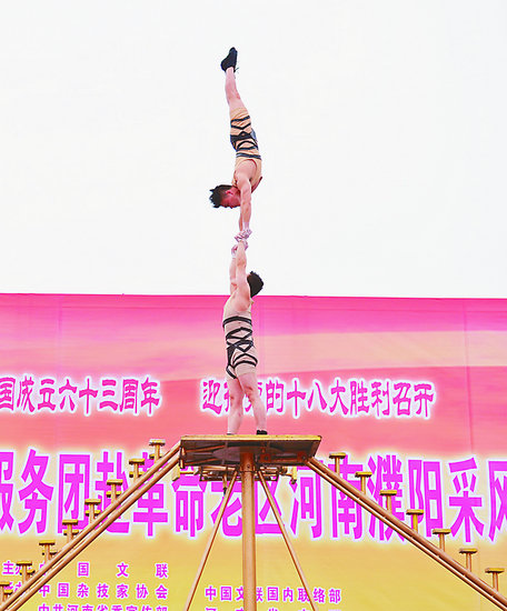 楊剛、牟強是遂寧市雜技團雜技節目《雙人倒立技巧》的主演,在國內外重大雜技賽場多次獲得金獎。他們每天都要在北京朝陽劇場演出2場。9月25日,晚上9點演完最后一場就連夜乘車奔赴濮陽,為了確保安全,團長親自帶隊,于26日凌晨趕到濮陽。稍事休息,就參加了上午的小分隊演出以及下午的主場演出。演出結束后,他們又連夜趕回北京準備次日的演出。