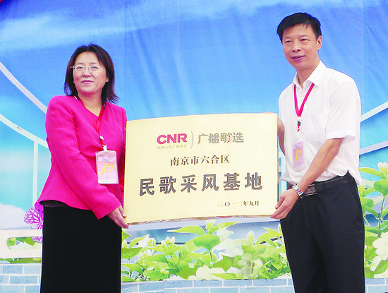 《廣播歌選》雜志社長覃繼紅(左一)為六合區“民歌采風基地”授牌,李亞太接牌