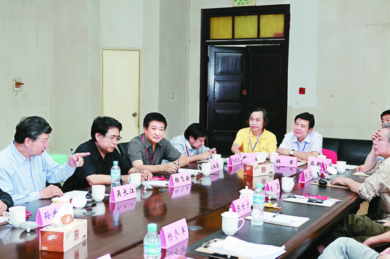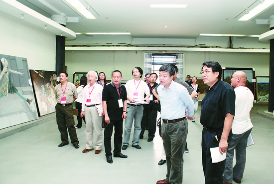 中國美協(xié)分黨組書記、駐會副主席吳長江(左一)對畫展評選工作進行小結