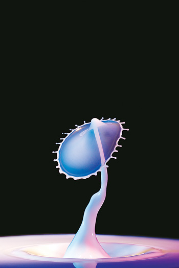 在國外,像我一樣癡迷于液體高速攝影的愛好者被稱為“Dropper”。每個人都有著從簡單入門、嘗試模仿、逐漸摸索竅門到精心創作的歷程。其中最為經典的模仿范本就是牛奶皇冠,我視其為液體攝影入門嘗試的典范。在手工拍攝皇冠時,不但磨練拍攝技巧,更是對耐心的培養。第一次捕捉到皇冠形態的欣喜,也唯有拍攝者自己能夠體會。