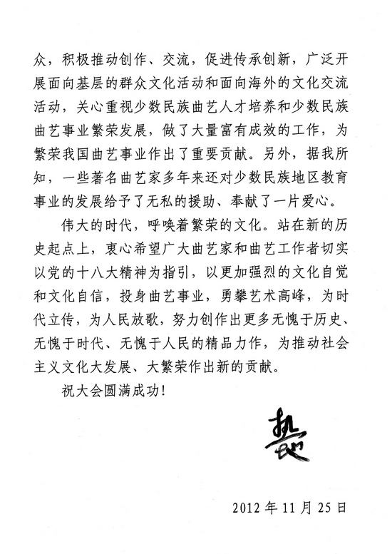 全國人大常委會原副委員長顧秀蓮,全國人大常委會原副委員長熱地,全國政協原副主席張懷西,中國文聯名譽主席周巍峙,全國政協教科文衛體委員會副主任、中國文學藝術基金會理事長胡振民,以及相關單位也向大會發來賀信、賀詞、賀電。