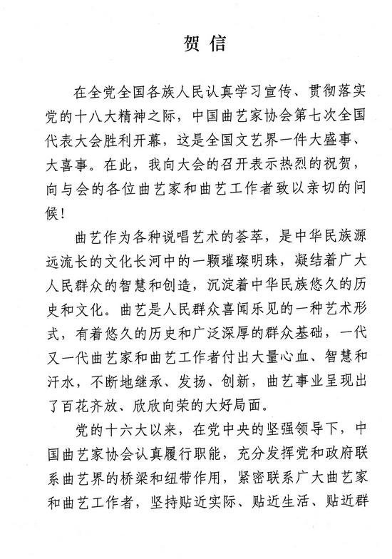 在全國上下深入學習宣傳貫徹黨的十八大精神之際,11月25日至29日,中國曲藝家協會第七次全國代表大會在京勝利召開。來自全國各省、自治區、直轄市和新疆生產建設兵團、解放軍、中央國家機關等單位以及港澳地區的近400名曲藝工作者代表齊聚一堂,共商曲藝事業發展大計。