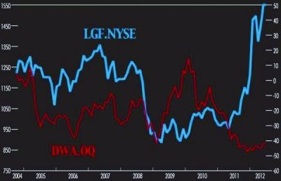 美國電影金融正從上市融資等傳統(tǒng)模式,走向證券化融資、電影基金融資等多元化融資方式。圖為獅門影業(yè)與夢工廠的股價走勢比較。