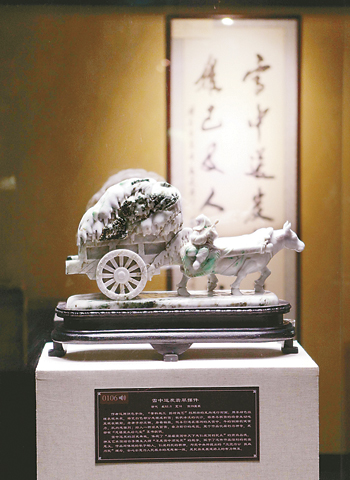 利用俏色手法、依照綹的走向進行細部刻畫,用墨綠色的紋理表現木炭,將瓷白色部分處理為積雪,柱狀冰凌的設計令寒冬飄雪的場景生動地呈現在眼前。只見老者手持皮鞭、身著棉服,駕車行進在凜冽的風雪中,牛的四蹄穩健有力、肌肉感強烈,給人一種頂風冒雪、奮力前行的感覺。圖中這件清代的《雪中送炭》翡翠擺件與中國歷代300余件館藏精品一同出現在北京神玉藝術館舉辦的神玉藝術珍寶展上,散發著量料施工、因材施藝之美。
