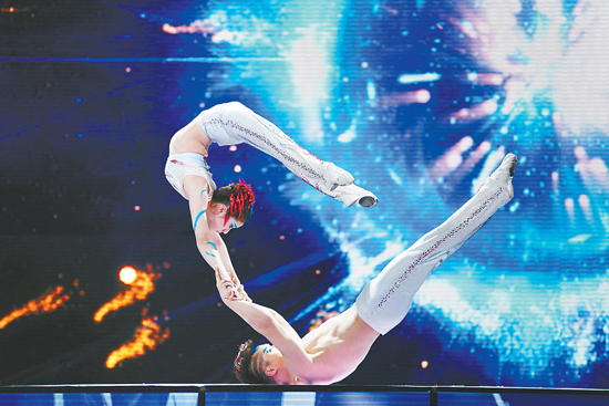 分別代表冰與火的男女雜技演員,在高高升起的舞臺上,配合著背景LED大屏幕展現(xiàn)的炫目圖像,恬靜中不失霸氣地用多個高難度姿勢展示著常人難以企及的柔韌、平衡、力量等絕技,以震懾全場的氣場,令觀眾屏息凝神且提心吊膽,匪夷所思又心悅誠服。節(jié)目以LED背景中極光照耀與冰火交融的瞬間,男女演員猛然相擁入懷結束,象征著冰與火最終打破了時空的運轉(zhuǎn)規(guī)律,歷經(jīng)沖突、碰撞而歸于平靜、和諧,深刻地詮釋著冰與火、男與女、陰與陽、剛與柔、動與靜等事物兩極的對立、溝通、妥協(xié)、平衡與和解,引人回味、遐想。