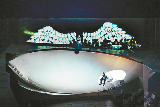 區別于以往“孟氏”舞臺的簡潔設置,《初戀》的舞臺頗為復雜。與孟京輝合作多年的舞美設計張武,這次設計了一個墜落的空間?!叭碎g”與“天堂”作為該劇的兩大主場景被搬進劇場,把這場“人間天堂”的對話多層次地呈現在劇院的舞臺之上。巨大的傾斜圓弧形臺面搭上舞臺,讓舞臺呈現更加立體。演員們利用圓弧形臺面自由走位,甚至可以像滑滑梯一樣穿梭,展現失重感和墜落感。