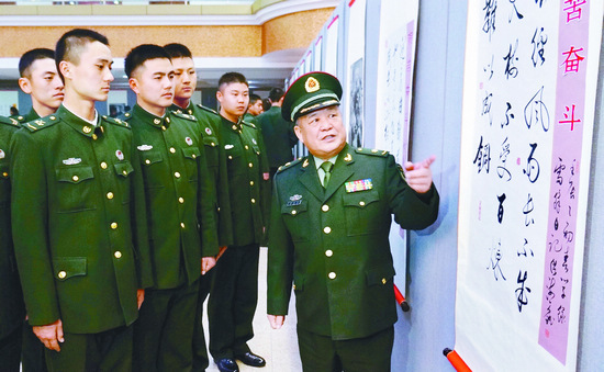 軍事博物館書畫院常務副院長、軍旅書法家李洪海從閱讀《雷鋒日記》過程中獲得啟發,從中節選出50條最精彩、最閃光的語錄片段,用書法的形式、書法的語言、書法的意境,精心創作了50幅書法作品,并由長城出版社集結出版。圖為李洪海在贈書儀式后向官兵們介紹自己創作的作品。