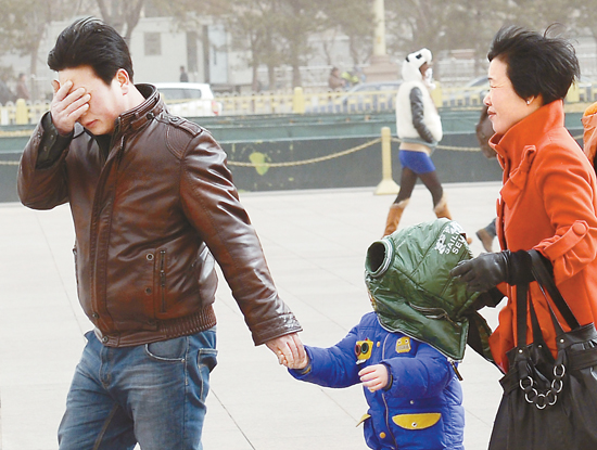 近日北京遭遇沙塵襲擊,游客在北京天安門廣場游覽時迎風前行。 新華社記者 金良快 攝